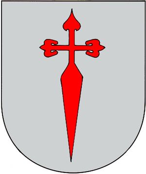 - Descripción: escudo partido; en el primer campo, de plata, la cruz de Santiago de gules. En el segundo, de azur, un águila despeñada de plata, encendida, picada, linguada y membrada de oro.