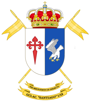 - Justificación: el primer cuartel es una referencia heráldica al escudo tradicional del Regimiento de Caballería Santiago, del que toma el nombre la unidad. En segundo cuartel, el campo de azur simboliza el cielo y el águila en actitud de atacar, representa la movilidad y misiones características de esta unidad.