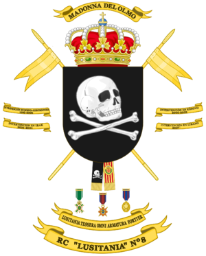 En la Hispania antigua se conocía como Lusitania a la región que se extendía por los actuales territorios de Portugal, Extremadura, Zamora y Salamanca, y cuyos habitantes, acaudillados por Viriato, ofrecieron una tenaz resistencia a las legiones romanas. Esta denominación pasó sucesivamente a diversas unidades de caballería española entre 1709 y 1936. Desde 1939 lo ostenta el Regimiento de Caballería Lusitania n.º 8, actualmente subordinado a la Brigada Almogávares VI, de Paracaidistas.
