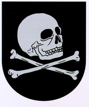 - Descripción: en campo de sable (negro), una calavera contornada y en lo bajo dos tibias pasantes en aspa, barra sobre banda, todo de plata.