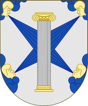 - Descripción: en campo de plata, movientes de los ángulos del escudo, los cuatro vientos cardinales de azur, saliendo de rostros de oro, perfilados de sable, sobre nubes de azur, resaltados de columna de orden jónico de plata con basa y capitel de oro y perfiladas de sable.