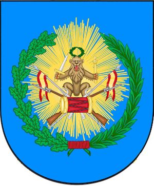 - Descripción: en campo de plata, león de oro, erguido y de frente, uñado y lenguado de gules (rojo) fileteado de sable (negro), que esgrime en la diestra una espada alta de oro, guarnecida de oro y en la siniestra un cetro de oro, sentado sobre trofeos de guerra compuestos por un tambor en faja de gules (rojo) y oro, tensores de sable (negro), acolados al tambor sucesivamente en aspa, dos mosquetes armados, dos sables envainados de sable (negro), con cazoleta de oro, empuñadura de azur (azul) y dos lanzas, asta de sable (negro) con punta de doble corte de oro y regatón de lo mismo, con banderolas bicolor flameantes, siendo el superior de oro y el inferior de gules (rojo), superado corona de laurel de sinople (verde) liadas con un lazo de oro. Todo orlado por corona de roble a la diestra y de laurel a la siniestra, de sinople (verde), unidas por sus tronco y liadas en punta de gules (rojo).