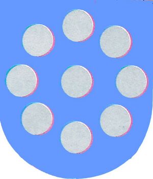 - Descripción: ocho besantes de plata formando un círculo con un noveno en su centro, sobre fondo de azur.