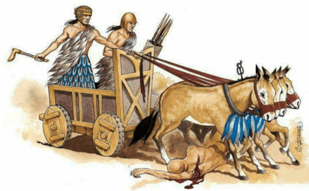 - Eannatum de Lagash conquistó Umma hacia 2450 AC. Su victoria quedó plasmada en la Estela de los buitres pero, lamentablemente, la escena inferior que representa al monarca a bordo de lo que parece un carro está deteriorada y no se aprecian sus detalles.