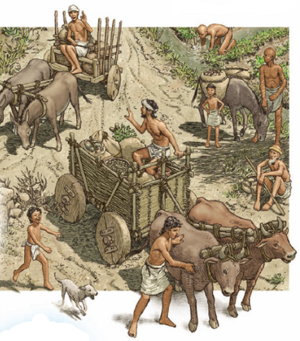 Hacia el año 8000 AC se produjo la Revolución neolítica en el territorio que hoy se conoce como Creciente Fértil: una región que se extiende en forma de media luna que abarcaba desde el delta del Nilo a la desembocadura del Tigris y el Éufrates, incluyendo Mesopotamia, Siria, Israel y el sur de Anatolia. Sus habitantes comenzaron a agruparse en pequeñas aldeas y a combinar la caza con el cultivo de cereales, principalmente una variedad de trigo llamada escanda. En lugar de perseguir a las manadas de animales salvajes, aprendieron a domesticarlos, encerrándolos en cercados junto a sus viviendas, siendo los primeros el perro y la oveja, y posteriormente la cabra, la vaca, el cerdo, el asno y, probablemente, el camello. Progresivamente aparecieron los primeros arados, los botes a vela, la rueda y la cerámica.